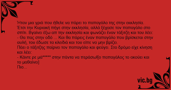 Ήταν μια γριά που ήθελε να πάρει το παπαγάλο της στην εκκλησία. Έτσι την Κυριακή πήγε στην εκκλησία, αλλά ξέχασε τον παπαγάλο στο σπίτι. Βγαίνει έξω απ την εκκλησία και φωνάζει έναν τάξιτζη και του λέει: