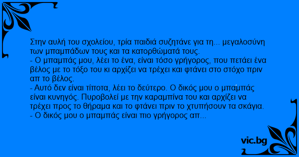 - Αυτό δεν είναι τίποτα, λέει το δεύτερο. Ο δικός μου ο μπαμπάς είναι κυνηγός. Πυροβολεί με την καραμπίνα του και αρχίζει να τρέχει προς το θήραμα και το φτάνει πριν το χτυπήσουν τα σκάγια.