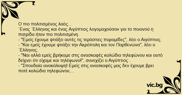 ΄Ενας ΄Ελληνας και ένας Αιγύπτιος λογομαχούσαν για το ποιανού η πατρίδα ήταν πιο πολιτισμένη.