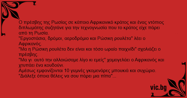 Ο πρέσβης της Ρωσίας σε κάποιο Αφρικανικό κράτος και ένας ντόπιος διπλωμάτης συζητάνε για την τεχνογνωσία που το κράτος είχε πάρει από τη Ρωσία.