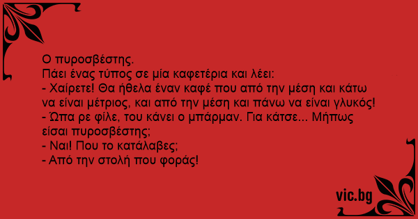 - Ώπα ρε φίλε, του κάνει ο μπάρμαν. Για κάτσε... Μήπως είσαι πυροσβέστης;