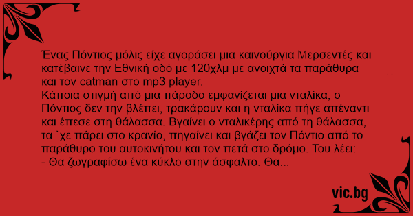 Ένας Πόντιος μόλις είχε αγοράσει μια καινούργια Μερσεντές και κατέβαινε την Εθνική οδό με 120χλμ με ανοιχτά τα παράθυρα και τον catman στο mp3 player.