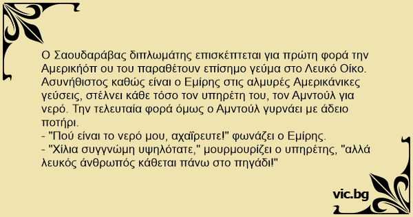 - "Χίλια συγγνώμη υψηλότατε," μουρμουρίζει ο υπηρέτης, "αλλά λευκός άνθρωπός κάθεται πάνω στο πηγάδι!"