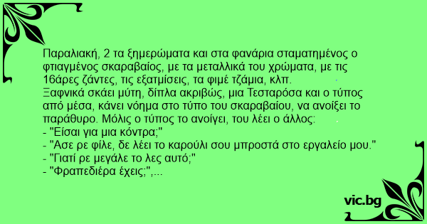 Ξαφνικά σκάει μύτη, δίπλα ακριβώς, μια Τεσταρόσα και ο τύπος από μέσα, κάνει νόημα στο τύπο του σκαραβαίου, να ανοίξει το παράθυρο. Μόλις ο τύπος το ανοίγει, του λέει ο άλλος: