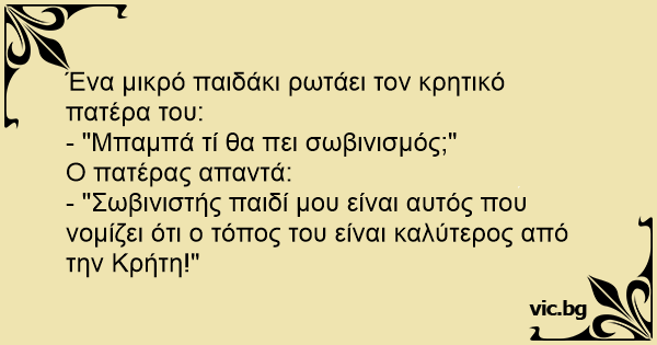 - "Σωβινιστής παιδί μου είναι αυτός που νομίζει ότι ο τόπος του είναι καλύτερος από την Κρήτη!"