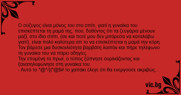 Ο σύζυγος είναι μόνος του στο σπίτι, γιατί η γυναίκα του επισκέπτεται τη μαμά της, που, δοθέντος ότι τα ζευγάρια μένουν μαζί, στο ίδιο σπίτι, (αν και ποτέ μου δεν μπόρεσα να καταλάβω γιατί), είναι πολύ καλύτερα απ το να επισκέπτεται η μαμά την κόρη.