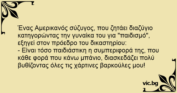Ένας Αμερικανός σύζυγος, που ζητάει διαζύγιο κατηγορώντας την γυναίκα του για "παιδισμό", εξηγεί στον πρόεδρο του δικαστηρίου:
