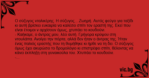 - Όχι, όχι στην ντουλάπα. Μπες κάτω απ το κρεβάτι, και τον σπρώχνει κάτω απ το κρεβάτι έτσι όπως ήταν γυμνός. Ανοίγει την πόρτα στον άντρα της, αυτός τη βλέπει με τη νυχτικιά, του ρχεται μια όρεξη και την πάει κατευθείαν στην κρεβατοκάμαρα. Εκεί αφού κάνουν ότι κάνουν αυτός ανάβει τσιγάρο. Εκεί που το καπνίζει όμως βλέπει κάτω απ το κρεβάτι να προεξέχει ένας κώλος.