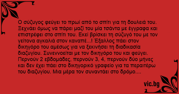 Περνούν 2 εβδομάδες, περνούν 3, 4, περνούν δύο μήνες και δεν έχει πάει στο δικηγορικό γραφείο για τα περαιτέρω του διαζυγίου. Μια μέρα τον συναντάει στο δρόμο. Απορημένος ο δικηγόρος του τον ρωτάει τι έγινε και χάθηκε.