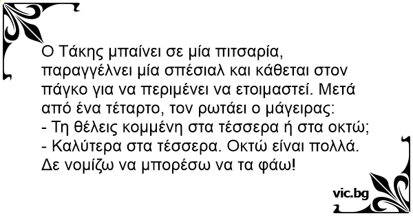 Ο Τάκης μπαίνει σε μία πιτσαρία, παραγγέλνει μία σπέσιαλ και κάθεται στον πάγκο για να περιμένει να ετοιμαστεί. Μετά από ένα τέταρτο, τον ρωτάει ο μάγειρας: