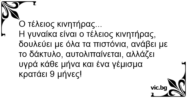 Η γυναίκα είναι ο τέλειος κινητήρας, δουλεύει με όλα τα πιστόνια, ανάβει με το δάκτυλο, αυτολιπαίνεται, αλλάζει υγρά κάθε μήνα και ένα γέμισμα κρατάει 9 μήνες!