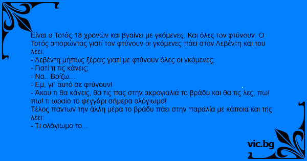 Είναι ο Τοτός 18 χρονών και βγαίνει με γκόμενες. Και όλες τον φτύνουν. Ο Τοτός απορώντας γιατί τον φτύνουν οι γκόμενες πάει στον Λεβέντη και του λέει: