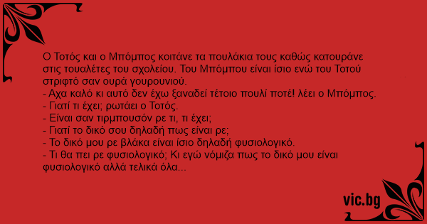 Ο Τοτός και ο Μπόμπος κοιτάνε τα πουλάκια τους καθώς κατουράνε στις τουαλέτες του σχολείου. Του Μπόμπου είναι ίσιο ενώ του Τοτού στριφτό σαν ουρά γουρουνιού.
