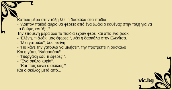 - "Ελένη, τι ζωάκι μας έφερες;", λέει η δασκάλα στην Ελενίτσα.