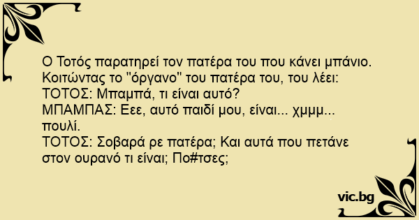 Ο Τοτός παρατηρεί τον πατέρα του που κάνει μπάνιο. Κοιτώντας το "όργανο" του πατέρα του, του λέει: