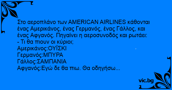 Στο αεροπλάνο των AMERICAN AIRLINES κάθονται ένας Αμερικάνος, ένας Γερμανός, ένας Γάλλος, και ένας Αφγανός. Πηγαίνει η αεροσυνοδός και ρωτάει: