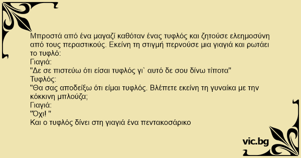Μπροστά από ένα μαγαζί καθόταν ένας τυφλός και ζητούσε ελεημοσύνη από τους περαστικούς. Εκείνη τη στιγμή περνούσε μια γιαγιά και ρωτάει το τυφλό:
