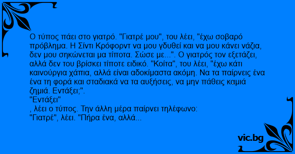 "Γιατρέ", λέει. "Πήρα ένα, αλλά δεν έκανε τίποτε. Ρεζίλι έγινα στην κοπέλα".