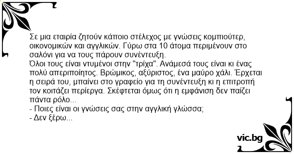 Σε μια εταιρία ζητούν κάποιο στέλεχος με γνώσεις κομπιούτερ, οικονομικών και αγγλικών. Γύρω στα 10 άτομα περιμένουν στο σαλόνι για να τους πάρουν συνέντευξη.