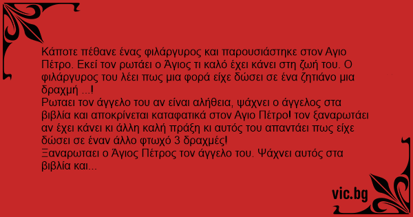 Κάποτε πέθανε ένας φιλάργυρος και παρουσιάστηκε στον Αγιο Πέτρο. Εκεί τον ρωτάει ο Άγιος τι καλό έχει κάνει στη ζωή του. Ο φιλάργυρος του λέει πως μια φορά είχε δώσει σε ένα ζητιάνο μια δραχμή ...!