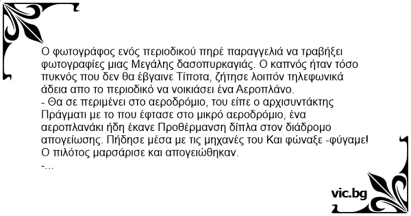 Ο φωτογράφος ενός περιοδικού πηρέ παραγγελιά να τραβήξει φωτογραφίες μιας Μεγάλης δασοπυρκαγιάς. Ο καπνός ήταν τόσο πυκνός που δεν θα έβγαινε Τίποτα, ζήτησε λοιπόν τηλεφωνικά άδεια απο το περιοδικό να νοικιάσει ένα Αεροπλάνο.