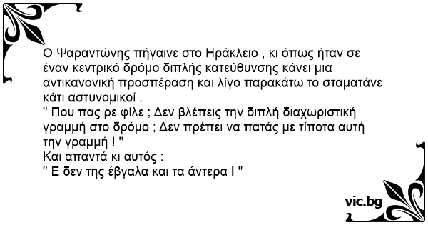 Ο Ψαραντώνης πήγαινε στο Ηράκλειο , κι όπως ήταν σε έναν κεντρικό δρόμο διπλής κατεύθυνσης κάνει μια αντικανονική προσπέραση και λίγο παρακάτω το σταματάνε κάτι αστυνομικοί .