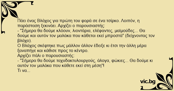Πάει ένας Βλάχος για πρώτη του φορά σε ένα τσίρκο. Λοιπόν, η παράσταση ξεκινάει. Αρχίζει ο παρουσιαστής: