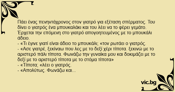 Ένας πενηντάχρονος, πάει στο γιατρό για εξέταση σπέρματος. Ο γιατρός του δίνει ένα άδειο βαζάκι και του λέει να το φέρει με δείγμα. Την άλλη μέρα πάει ο πενηντάχρονος με το βαζάκι άδειο. - Τι...
