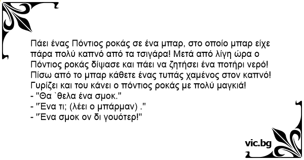 Πάει ένας Πόντιος ροκάς σε ένα μπαρ, στο οποίο μπαρ είχε πάρα πολύ καπνό από τα τσιγάρα! Μετά από λίγη ώρα ο Πόντιος ροκάς δίψασε και πάει να ζητήσει ένα ποτήρι νερό! Πίσω από το μπαρ κάθετε ένας τυπάς χαμένος στον καπνό!