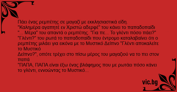 Δείπνο?", οπότε τρέχει στο πίσω μέρος του μαγαζιού να το πει στον παπά