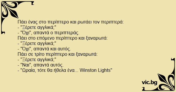 Πάει ένας στο περίπτερο και ρωτάει τον περιπτερά: - "Ξέρετε αγγλικά;" - "Όχι", απαντά ο περιπτεράς. Πάει στο επόμενο περίπτερο και ξαναρωτά: - "Ξέρετε αγγλικά;" - "Όχι", απαντά και αυτός. Πάει σε τρίτο περίπτερο και ξαναρωτά: - "Ξέρετε αγγλικά;" - "Ναι", απαντά αυτός. - "Ωραία, τότε θα ήθελα ένα... Winston Lights"