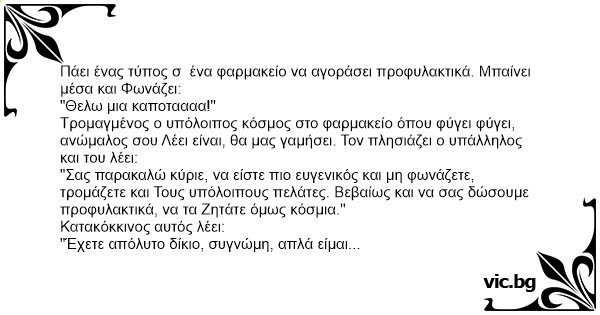 Τρομαγμένος ο υπόλοιπος κόσμος στο φαρμακείο όπου φύγει φύγει, ανώμαλος σου Λέει είναι, θα μας γαμήσει. Τον πλησιάζει ο υπάλληλος και του λέει: