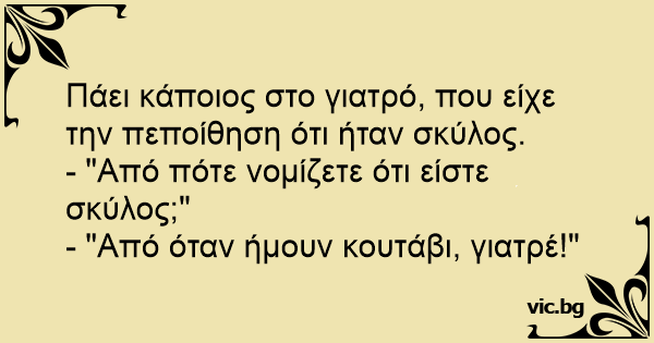 - Γιατρός: - «Για πέστε μου κύριέ μου, απο πότε νομίζετε ότι είστε σκύλος?»-Ασθενής: - «Μα, απο τότε που ήμουνα κουταβάκι γιατρέ μου….»