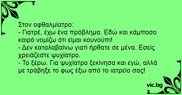 - Γιατρέ, κάτι πάθαν τα μάτια μου! Βλέπω μπλε και πράσινες κηλίδες.