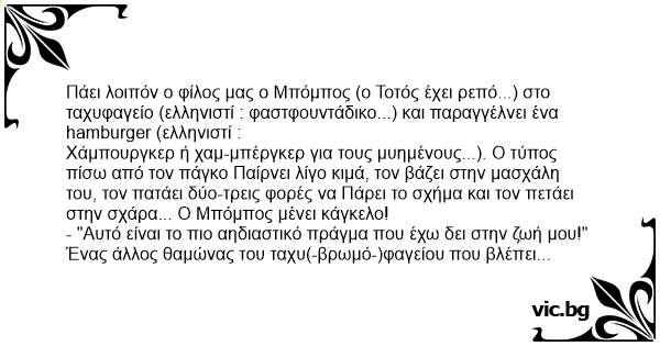 Πάει λοιπόν ο φίλος μας ο Μπόμπος (ο Τοτός έχει ρεπό...) στο ταχυφαγείο (ελληνιστί : φαστφουντάδικο...) και παραγγέλνει ένα hamburger (ελληνιστί :
