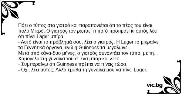 Πάει ο τύπος στο γιατρό και παραπονιέται ότι το πέος του είναι πολύ Μικρό. Ο γιατρός τον ρωτάει τι ποτό προτιμάει κι αυτός λέει ότι πίνει Lager μπίρα.