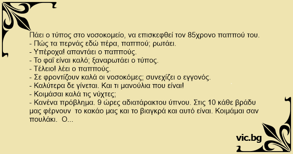 - Κανένα πρόβλημα. 9 ώρες αδιατάρακτου ύπνου. Στις 10 κάθε βράδυ μας φέρνουν το κακάο μας και το βιαγκρά και αυτό είναι. Κοιμάμαι σαν πουλάκι. Ο εγγονός, προβληματισμένος από την τελευταία απάντηση του παππού του, πάει και βρίσκει την προϊσταμένη.