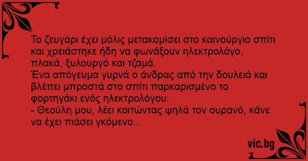 Ένα απόγευμα γυρνά ο άνδρας από την δουλειά και βλέπει μπροστά στο σπίτι παρκαρισμένο το φορτηγάκι ενός ηλεκτρολόγου: