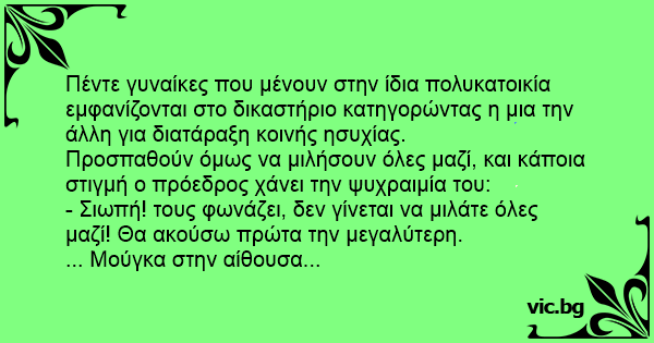 Πέντε γυναίκες που μένουν στην ίδια πολυκατοικία εμφανίζονται στο δικαστήριο κατηγορώντας η μια την άλλη για διατάραξη κοινής ησυχίας.
