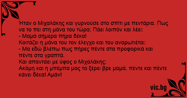 Ήταν ο Μιχαλάκης και γυρνούσε στο σπίτι με πεντάρια. Πως να το πει στη μάνα του τώρα; Πάει λοιπόν και λέει: