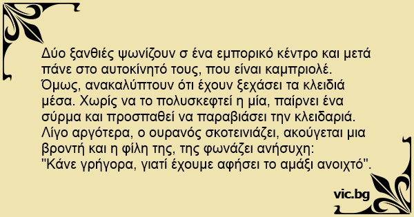 Η οροφή Две блондинки отиват на пазар. Блондинка на бензиностанция. Зарежда колата, отива, плаща, връща се, и... Класическа ситуация - ключът вътре, колата заключена... Eine Blondine stürmt in eine Werkstatt und hechelt: There were these two blonds and they locked their keys in their car. A blonde walks into a gas station and says to the manager, "I locked my keys in my car. Do you have a coat hanger or something I can stick through the window to unlock the door?" There are three blonds that went to the store. ,After they get done in the store one of the blondes realizes that she locked her keys in her car. ,The first blond tried using a screwdriver to unlock the door. ,The second blond tried using a hanger. ,The third blond tried using... Μια ξανθιά κλείδωσε τα κλειδιά της στο αυτοκίνητο. Πηγαίνει λοιπόν σε ένα συνεργείο και ζητάει ένα σύρμα για να τραβήξει την ασφάλεια από το λίγο ανοιχτό παράθυρο του αυτοκινήτου της. Έκπληκτος ο μηχανικός που μια ξανθιά μπόρεσε να σκεφθεί μια τέτοια λύση, της λέεί και βέβαια έχω σύρμα, αλλά θα... Två blondiner hade råkat låsa in sina nycklar i bilen. En av blondinerna försökte bryta sig in i bilen medans den andra kollade så att kusten var klar. Till sist gav den första blondinen upp och sa: - Jäklar, jag kan inte komma in i bilen.... Deux blondes sont dans un stationnement en train d'essayer de débarrer la porte de leur Mercedes avec un support car elles ont embarré les clefs a l'intérieur... La première blonde dit : - Maudit,... Twee blondjes staan bij de auto te sukkelen met het slot. Ze zijn namelijk de sleutel kwijt. Plots begint het zachtjes te regenen. Zegt het ene blondje tegen het andere: "Schiet op, het regent... Det var en gang to blondine som var å handlet. Da de kom tilbake til bilen, fant de ut at nøklen var låst inne. De to blondinene sto der i mange timer for å prøve å få opp døren, men til ingen... Sally and Brenda (both blondes) exited and locked the car in a hurry, forgetting to remove the key, which was in the ignition. Realizing the mistake, Sally asked, "Why don't we get a coat hanger... Δυο ξανθιές προσπαθούν να ξεκλειδώσουν την πόρτα του αυτοκινήτου τους με μια κρεμάστρα. Πρώτη ξανθιά: Δεν μπορώ να την ξεκλειδώσω αυτή την πόρτα Δεύτερη ξανθιά: Καλύτερα να βιαστείς. Έχει ξεκινήσει...