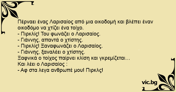 - Πιρκλίς! Του φωνάζει ο Λαρισαίος.