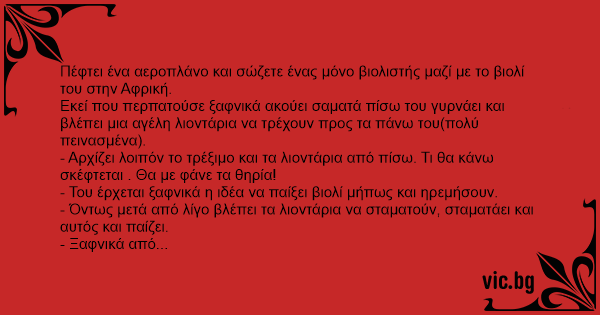 - Ξαφνικά από μακριά τρέχει ένα λιοντάρι και τον κατασπαράζει τον βιολιστή.