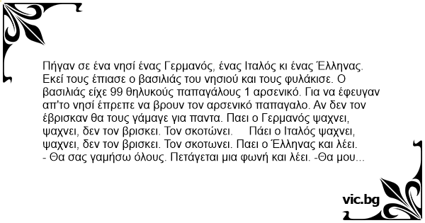 Πήγαν σε ένα νησί ένας Γερμανός, ένας Ιταλός κι ένας Έλληνας. Εκεί τους έπιασε ο βασιλιάς του νησιού και τους φυλάκισε. Ο βασιλιάς είχε 99 θηλυκούς παπαγάλους 1 αρσενικό. Για να έφευγαν απ'το νησί έπρεπε να βρουν τον αρσενικό παπαγαλο. Αν δεν τον έβρισκαν θα τους γάμαγε για παντα. Παει ο Γερμανός ψαχνει, ψαχνει, δεν τον βρισκει. Τον σκοτώνει. Πάει ο Ιταλός ψαχνει, ψαχνει, δεν τον βρισκει. Τον σκοτωνει. Παει ο Έλληνας και λέει.