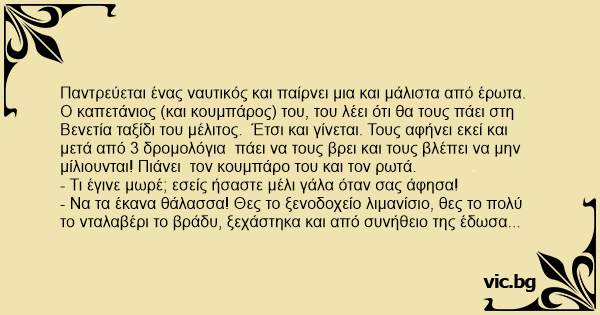 Παντρεύεται ένας ναυτικός και παίρνει μια και μάλιστα από έρωτα. Ο καπετάνιος (και κουμπάρος) του, του λέει ότι θα τους πάει στη Βενετία ταξίδι του μέλιτος. Έτσι και γίνεται. Τους αφήνει εκεί και μετά από 3 δρομολόγια πάει να τους βρει και τους βλέπει να μην μίλιουνται! Πιάνει τον κουμπάρο του και τον ρωτά.