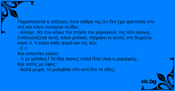 Παραπονιέται η σύζυγος στον άνδρα της ότι δεν έχει φαντασία στο σεξ και κάνει συνέχεια τα ίδια...