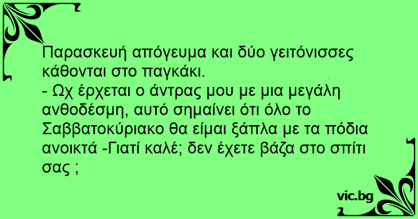 - Ωχ έρχεται ο άντρας μου με μια μεγάλη ανθοδέσμη, αυτό σημαίνει ότι όλο το Σαββατοκύριακο θα είμαι ξάπλα με τα πόδια ανοικτά -Γιατί καλέ; δεν έχετε βάζα στο σπίτι σας ;