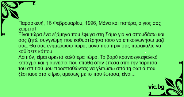 Παρασκευή, 16 Φεβρουαρίου, 1996, Μάνα και πατέρα, ο γιος σας χαιρετά!