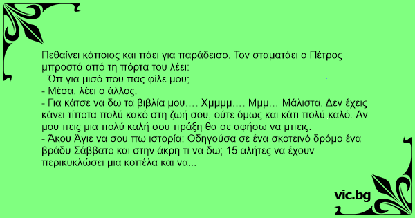 Πεθαίνει κάποιος και πάει για παράδεισο. Τον σταματάει ο Πέτρος μπροστά από τη πόρτα του λέει: