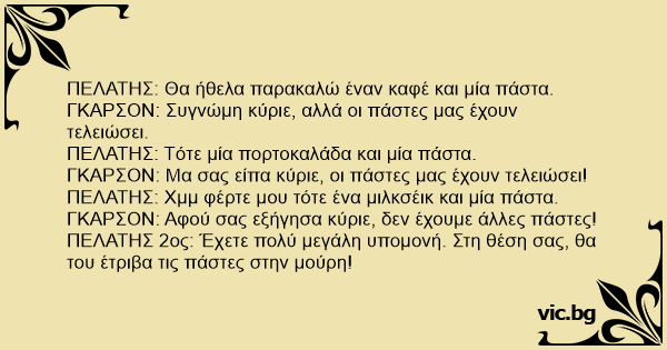 ΠΕΛΑΤΗΣ: Χμμ φέρτε μου τότε ένα μιλκσέικ και μία πάστα.